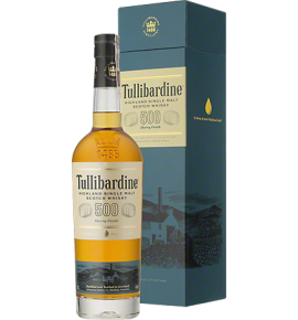 Tullibardine Single Malt Scotch Whisky 500 Sherry Cask Finish to whisky słodowa z jednej destylarni, która leżakowała w beczkach po Burbonie i Sherry. Charakteryzuje się intensywnym, ciemnobrązowym kolorem. Podczas degustacji wyczuwalny aromat toffi, jabłek i zboża, a w smaku odnajdziemy wanilię, toffi, daktyle i przyprawy.